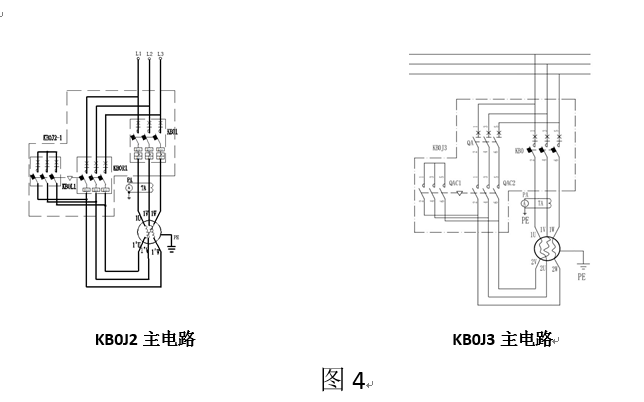 4. KB0J2、KB0J3、KB02J2、KB02J3主電路與普通KB0J、KB02J的接線方式區(qū)別是KB0或KB02主電路接線位置,普通的KB0J、KB02J接線方式:接在電源進(jìn)線端主電路KB0承受的是線電流In。而采用圖4(KB0J2、KB0J3、KB02J2、KB02J3)分流的接線方式后,KB0或KB02主回路接的位置有一些變化,啟動(dòng)完成后主開關(guān)KB0或KB02承受的是相電流In/3(見表4)。KB0J2、KB0J3、KB02J2、KB02J3全壓工作時(shí)流過每臺(tái)主開關(guān)的相電流的計(jì)算公式見表4。(電纜的截面積選擇:引至電動(dòng)機(jī)端的電纜截面積承載的電流不小于分流后,流過主開關(guān)工作電流值;引至星三角減壓起動(dòng)器進(jìn)線端的(進(jìn)電源端)電纜截面積承載的電流不小于電動(dòng)機(jī)全壓工作時(shí)額定電流值。)